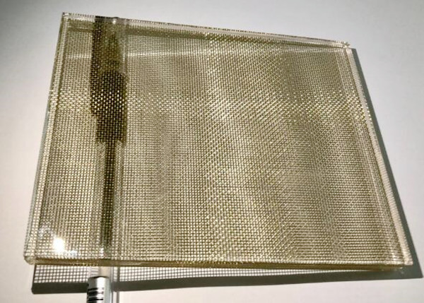 Bronze decorative fabric glass laminated is Bronze coated polymer mesh fabric laminated with low irong glass by EVA, TPU, PVB or SGP through oven or autoclave. Metalspurc glass has very high metal glossness and different privacy level can be available with transmittance light between 25-60%. Aluminium,Copper,Bronze,Inox,Titanium metal coating and customized color and pattern can be available.
